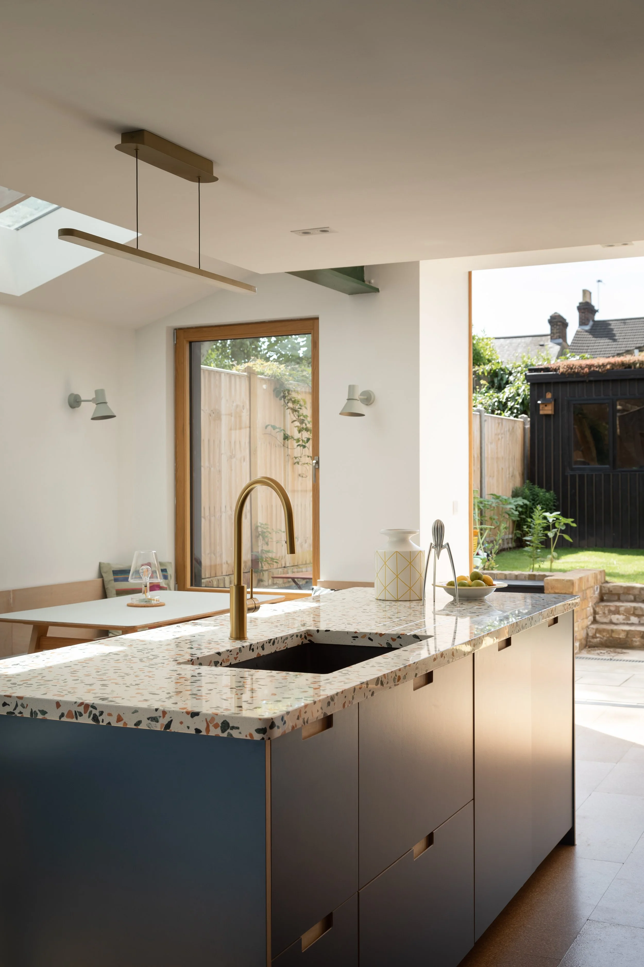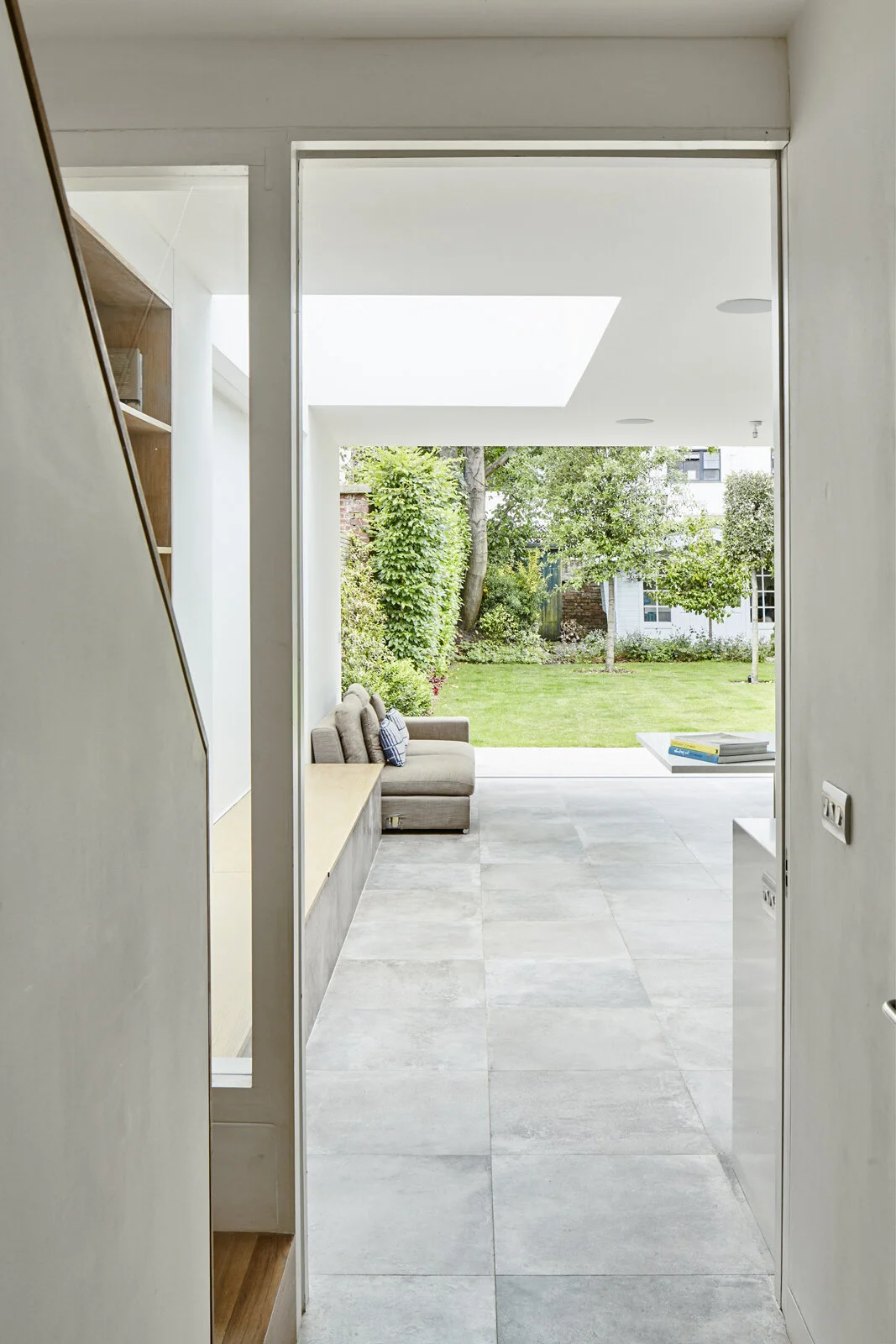The floor throughout the extension was lowered to provide additional head height and merges against the steps of the rear garden.