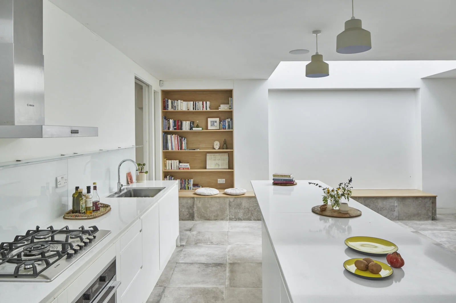 A new glazed roof light alongside the new side extension brings light deep into the core of the house and illuminates the heart of the home : the newly created open kitchen and dining.